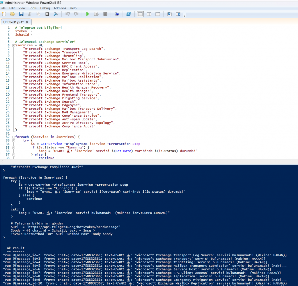 $msg = "UYARI ⚠️: '$service' servisi bulunamadı! (Makine: $env:COMPUTERNAME)"