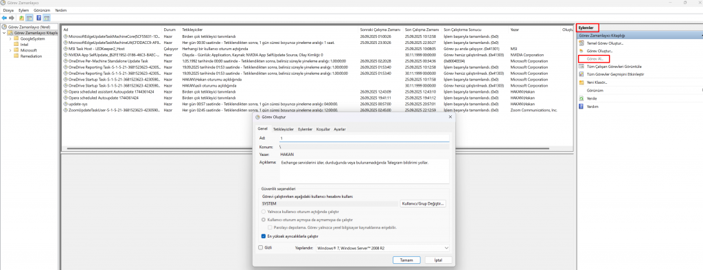 Tüm konfigürasyon tamamlandı. Scripti C:\Scripts\ExchangeAllServicesCheck.ps1 dizini altında kaydettim. Kolaylık sağlaması için zamanlanmış görevi hazırladığım XML dosyası üzerinden oluşturacağım. Bu sayede PowerShell scripti her 5 dakikada bir belirlediğim servisleri kontrol edecek ve herhangi bir problem durumunda Telegram üzerinden bildirim gönderecektir.